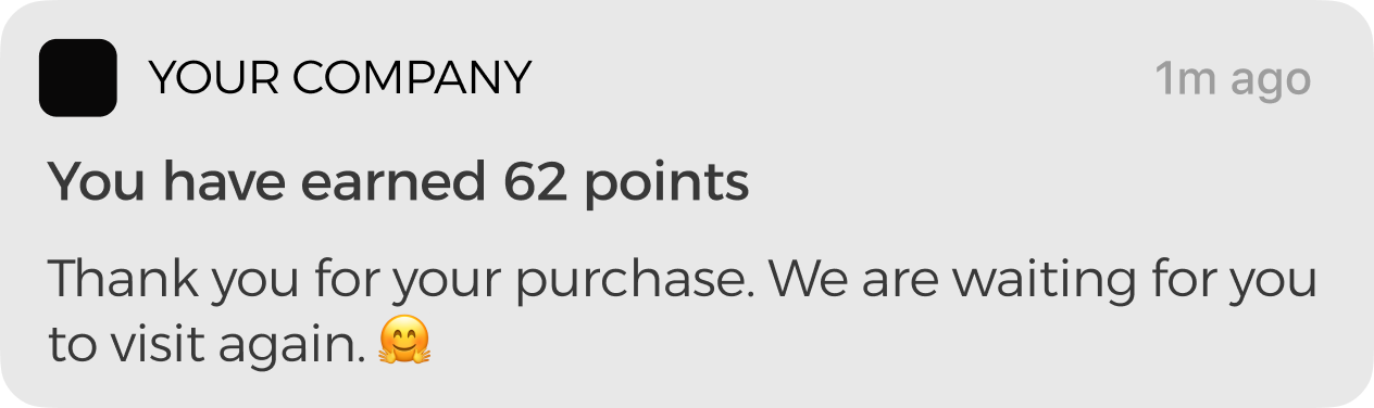 Automatic PUSH notifications with the transaction information is sent instantly at the time of sale. The message informs the client about their current loyalty and reward status.